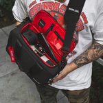 The Black/Red Camera bag / Utility Bag is perfectly sized & versatile. Its great for day trips, or travel. With bold red accents, durable construction, and multiple compartments, it combines style and functionality for life on the go.